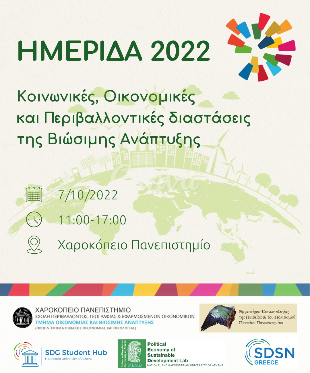 Στο πλαίσιο της Ευρωπαϊκής Εβδομάδας Βιώσιμης Ανάπτυξης 2022, το Εργαστήριο Κοινωνιολογίας της Παιδείας και του Πολιτισμού του Παντείου Πανεπιστημίου σε συνεργασία με το Εργαστηρίου Εφαρμοσμένων Οικονομικών και Βιώσιμης Ανάπτυξης και το SDG Students Hub του Χαροκοπείου Πανεπιστημίου, το Εργαστήριο Πολιτικής Οικονομίας της Βιώσιμης Ανάπτυξης του Πανεπιστημίου Αθηνών και το UN SDSN Greece διοργανώνουν ημερίδα με θέμα: Κοινωνικές, Οικονομικές και Περιβαλλοντικές διαστάσεις της Βιώσιμης Ανάπτυξης .